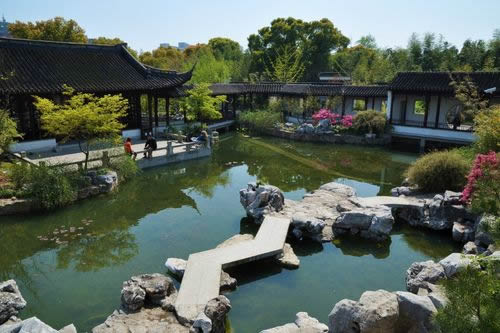 古猗園位于上海市西北郊嘉定區(qū)南翔鎮(zhèn)東,離市中心21公里。園林正門向南朝向滬宜公路,西近南翔老街、云翔寺,北聯(lián)滬嘉公路,占地面積130余畝。始建于明嘉靖年間,原名“猗園”,取自《詩(shī)經(jīng)》中“綠竹猗猗”一句。清乾隆十一年(1746年),更名“古猗園”。為上海五大古典園林之一。全園布局,主要由四面環(huán)水的兩塊島地組成。以五座平橋與兩岸連通,以一座曲橋使兩島相接。劃分為逸野堂、戲鵝池、松鶴園、青清園、鴛鴦湖、南翔壁6個(gè)景區(qū),是上海最古老的攬勝之一。