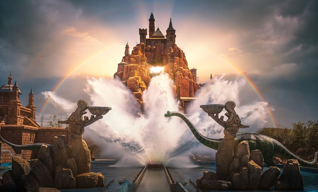 逃出恐龍島是以吳哥窟為主要建筑風(fēng)格的大型室內(nèi)漂流歷險(xiǎn)主題項(xiàng)目,游客將乘坐小車進(jìn)入危險(xiǎn)的侏羅紀(jì)時(shí)代,在茂密的叢林里展開一場驚心動(dòng)魄的冒險(xiǎn)。巨型恐龍的隆隆腳步震動(dòng)著大地、頭頂上盤旋著空中獵手、巨石突然從眼前滾落,緊張和恐怖彌漫四周。隨后游船從幾十米高的懸崖瀑布上急速下墜,讓游客在驚叫聲中經(jīng)歷一場永生難忘的恐龍島冒險(xiǎn)之旅。