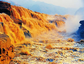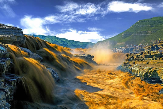 在高處河岸上,幾乎是看不到“龍槽”和黃河水流,只能看到紫褐色基巖河床中一線急騰翻卷的黃濁水塵和聽到轟鳴不息的奔騰濤聲。這槽中激流就象一鍋滾沸的水,左奔右奪,奔騰翻滾急下,激起的水霧彌漫在龍槽之上,使黃河在這里變得朦朦朧朧。每逢汛期黃河水漲時(shí),洪水溢出壺口龍槽一端,龍槽東岸會(huì)出現(xiàn)一道一、二千米長(zhǎng)的漫流水簾,十分壯觀。遠(yuǎn)望龍槽,彎彎曲曲的峽中石槽,活象一條搖頭擺尾的巨龍,壺口是龍頭,一口吞沒黃河巨流。孟門是龍尾,腹泄河水于下游。