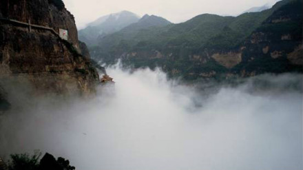 4、“賀知章登山道”,是從巖溝直插巖上的一條險道。據(jù)《大唐汾州抱腹寺碑》左側(cè)唐代詩人賀知章題記,他當(dāng)年登綿山是先由寺僧用布把他拽到50米以上的“棋盤洞”附近,再由棋盤洞攀100米云梯到云峰寺下;然后沿120和60級石階到鐵索嶺下手抓70余米的鐵索登上鐵索嶺,并一股作氣爬上摩斯塔的。全長500余米的路程幾乎都是75度的絕壁。既是一處奇險的自然景觀,又具有豐厚的人文歷史,可謂天下奇觀。