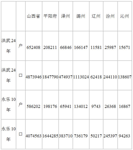 據(jù)《山西通志》記載,洪武元年(1368年)到永樂(lè)十五年(1417年),被移之民以晉南為多,其次為晉東南、晉中數(shù)縣。明代初年,山西省轄5府、3直隸州、16散州、79縣。史書(shū)記載的明初移民主要有平陽(yáng)府轄的28縣,潞安府轄的8縣,汾州府轄的7縣,澤州轄的4縣,沁州簿的2縣,遼州轄的2縣。這些地區(qū)共有51縣,而平陽(yáng)府就轄28縣。