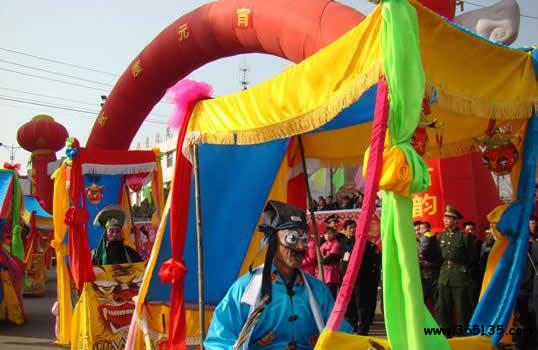 旱船:用竹條或木條制成船的模型,周圍用各色彩布遮蓋。表演者每人一船。以歷史或現(xiàn)代劇目為內(nèi)容,表演時,一人在船前劃船引導(dǎo),數(shù)人在后駕船,翩翩起舞,并變換各種隊形表演。東寨的旱船表演最為壯觀。