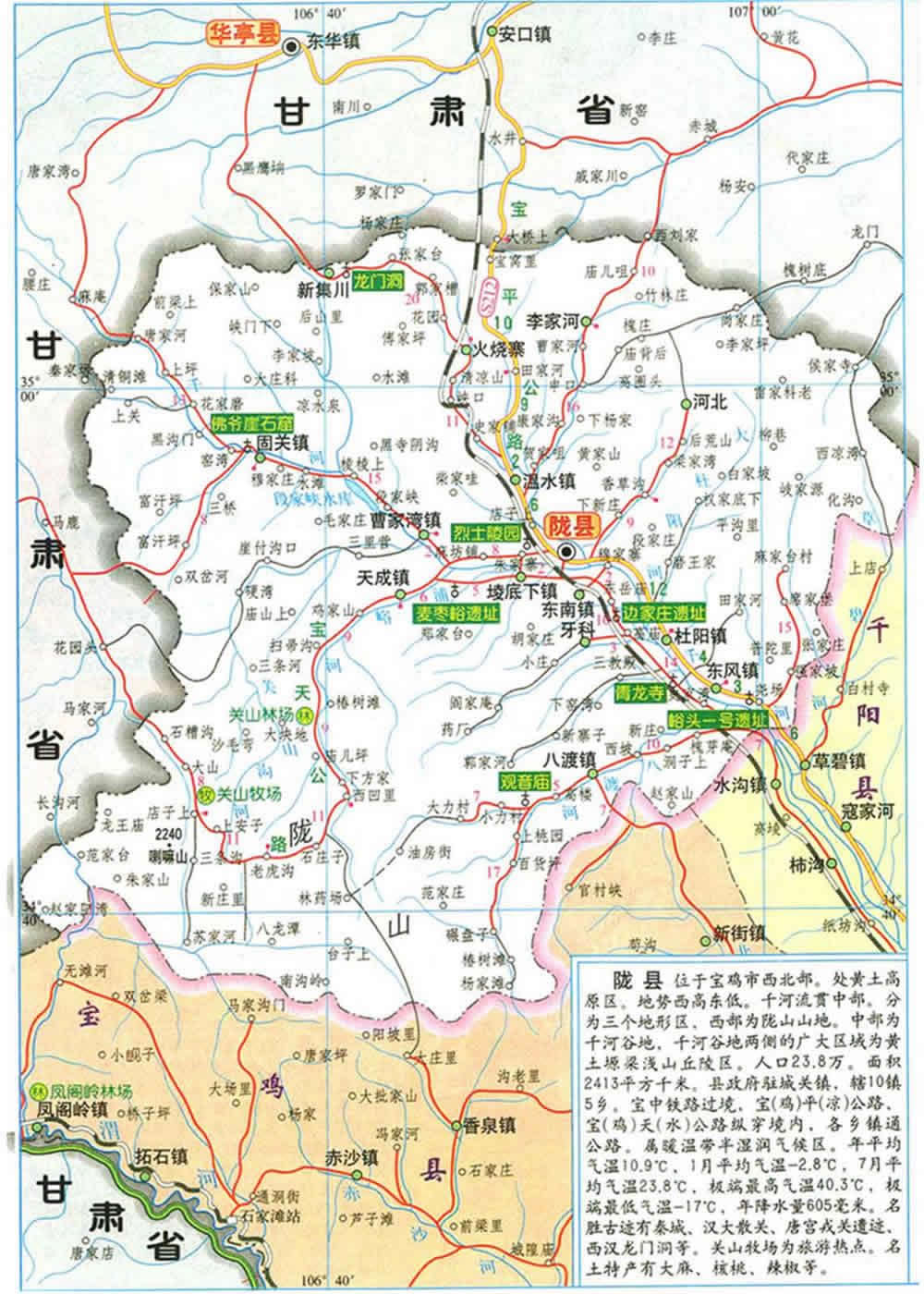 隴縣行政隸屬陜西省寶雞市,地處渭北高原西部邊緣地區(qū)(關(guān)山東麓),位于東經(jīng)106°26′32″~107°8′11″,北緯34°35′17″~35°6′45″,東連千陽(yáng)縣,南鄰寶雞縣,西北與甘肅省的清水、張家川、華亭、崇信等縣接壤,南北寬57.6公里,東西長(zhǎng)59.7公里,境內(nèi)川原狹小,山大溝深,地勢(shì)險(xiǎn)要,是關(guān)中通往西北的主要關(guān)隘之一,是古代兵家必爭(zhēng)之地,古有“關(guān)狹鑰匙”。