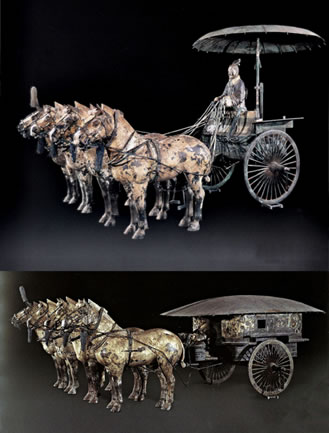 銅車馬是秦始皇的陪葬品之一,象征著秦始皇鑾駕的一部分。銅車馬的形制是模仿實實在在真車的形狀。以前考古發(fā)現(xiàn)的車都是木質(zhì)的,出土時已腐朽,銅車馬的出土使今人能夠清楚地看到古代御用車駕的真實面貌。銅車馬是按秦始皇御用車隊中屬車二分之一的比例縮小制成的,車蓋以及車輿內(nèi)外彩繪著精美的紋樣;兩乘銅車馬上的金銀飾品重達14公斤,顯示了銅車馬高貴的等級。