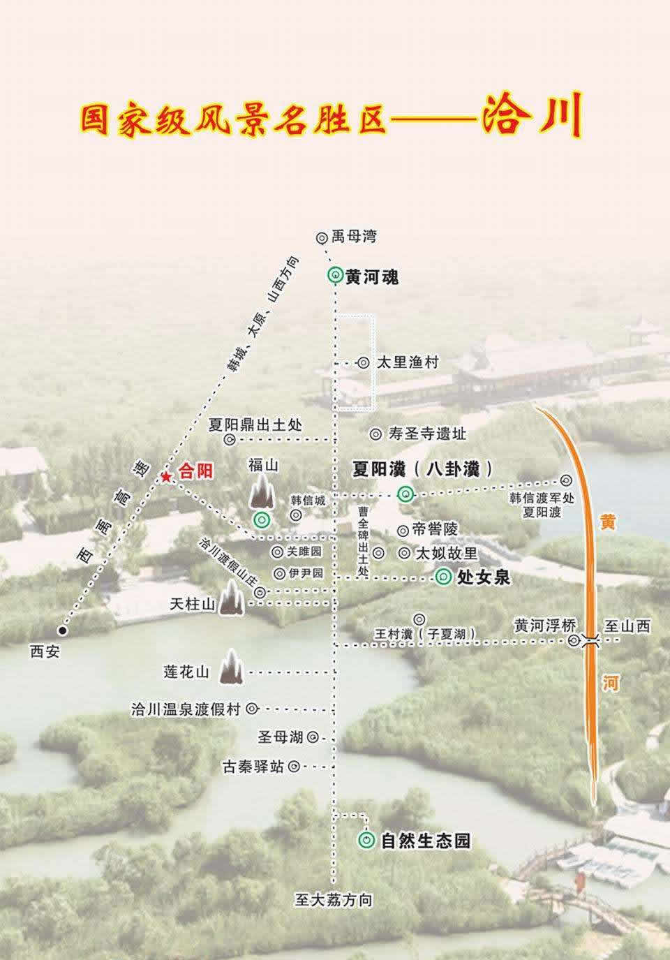洽川自古就是旅游勝地,這里“山有飛浮之異,水有神瀵之奇”。洽川的自然景觀有六個(gè)亮點(diǎn):