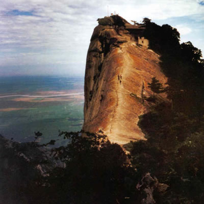 西峰海拔2082米,華山主峰之一,因位置居西得名。又因峰巔 有巨石形狀好似蓮花瓣,古代文人多稱其為蓮花峰、芙蓉峰。袁宏道在他的《華山永》中記述:“石葉上覆而橫裂”;徐霞客《游太華山日記》中也記述:“峰上石聳起,有石片覆其上,如荷花!崩畎自(shī)中有“石作蓮花云作臺(tái)”句,也當(dāng)指此石。