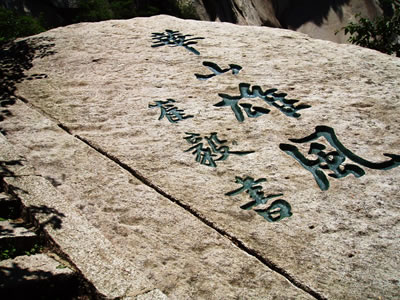 東峰頂生滿巨檜喬松,濃蔭蔽日,環(huán)境非常清幽。游人自松林間穿行,上有團(tuán)才綠蔭,如傘如蓋,耳畔陣陣松濤,如吟如詠,頓覺(jué)心曠神怡,超然物外。明書畫家王履在《東峰記》中談他的體會(huì)說(shuō):高大的檜松蔭蔽峰頂,樹(shù)下石徑清爽幽靜,風(fēng)穿林間,松濤涌動(dòng)更添一段音樂(lè)般的韻致,其節(jié)律,此起彼伏,好象吹彈絲竹,敲擊金石,多么美妙啊。