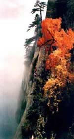 峰南側(cè)是千丈絕壁,直立如削,下臨一斷層深壑,同三公山、三鳳山隔絕。南峰由一峰二頂組成,東側(cè)一頂叫松檜峰,西側(cè)一頂叫落雁峰,也有說(shuō)南峰由三頂組成,把落雁峰之西的孝子峰也算在其內(nèi)。這樣一來(lái),落雁峰最高居中,松檜峰居?xùn)|,孝子峰居西,整體形象一把圈椅,三個(gè)峰頂恰似一尊面北而坐的巨人。明朝人袁宏道在他的《華山記》一書中記述南峰形象說(shuō):“如人危坐而引雙膝!