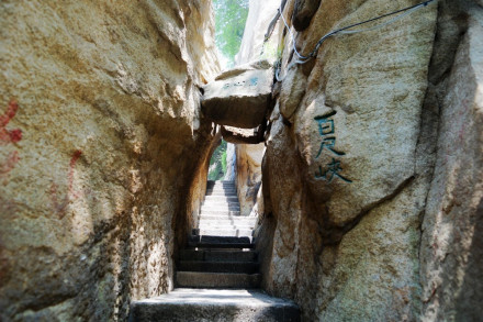 南天門石坊至朝元洞西,路依崖鑿出,長(zhǎng)20米,寬二尺許,為上段。