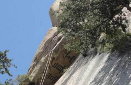 關(guān)于全真巖各類史志書籍記載頗多!度艌D會(huì)》載:“靜室旁有巖,高數(shù)十丈,遙覆其室,并書‘全真巖’三字!薄度A岳圖經(jīng)》中記述,全真巖三字每字大約七八尺高,鐫刻在那樣一個(gè)地方,除過(guò)能騰云駕霧的神仙,凡夫俗子肯定是辦不到的。明書畫大家王履的《南峰記》中記述得列為形象:巖好像一個(gè)彎腰人的頭部,遠(yuǎn)遠(yuǎn)遮蓋住腹部的石室。倒坎巖頂端鐫“全真巖”三字,并涂以紅色。世上沒(méi)有神仙,刻字肯定是人類所為,但在這樣特殊的位置,上不可上,下不可下,除非懸浮于空中才能可能。古人是如何做到這一點(diǎn),迄今無(wú)解。