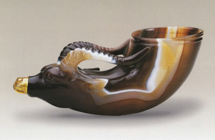 酒器,長15.5厘米,口徑5.9厘米。鑲金獸首瑪瑙杯選材精良,巧妙利用玉料的俏色紋理雕琢而成。杯體為角狀獸首形,獸雙角為杯柄。嘴部鑲金帽,眼、耳、鼻皆刻劃細(xì)微精確。從選材、設(shè)計到工藝,都可稱為唐代玉雕藝術(shù)的精品,是迄今發(fā)現(xiàn)唐代唯一一件俏色玉雕,是唐代玉器做工最精湛的一件,也是唐代中外文化交流的產(chǎn)物。