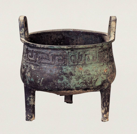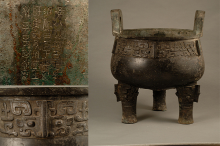 鑄于周康王時期,造型敦厚雄偉,紋飾莊重神奇。通高77厘米,口徑56.5厘米。立耳,深腹,平沿方唇,三柱足?谘叵嘛椄〉駹铟吟鸭y,地襯細(xì)雷紋。三足根部飾大饕餮面。雙耳外側(cè)各飾一條曲體上緣的夔龍。腹外壁及底部厚積煙跡,顯系長期使用所致。腹內(nèi)壁鑄有銘文28字。旟鼎承襲商代圓鼎風(fēng)格,造型厚重莊嚴(yán),紋飾十分精美,所刻銘文是研究周初土地制度的重要史料,具有珍貴的歷史及藝術(shù)價值,加之鑄刻時代明確,被公認(rèn)為周康王時的標(biāo)準(zhǔn)器,是一尊著名的西周時期的國寶。