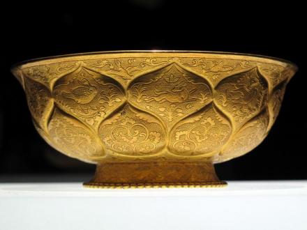 通高5.5厘米,口徑13.7厘米,足徑6.7厘米。錘擊成型,侈口,圓唇,鼓腹,平底,喇叭形圈足。器身滿飾珍珠地紋,腹部捶出雙層仰蓮瓣,上層蓮瓣中分別鏨鴛鴦、鸚鵡、鴻雁、鸛翎、鹿、狐、獐、兔、鴨等珍禽異獸;下層蓮瓣內(nèi)刻忍冬花草。碗內(nèi)底刻寶相花。圈足飾方勝紋一周,內(nèi)刻鼓翼云端的飛鳥一只及流云數(shù)朵,底沿以小聯(lián)珠綴成。碗內(nèi)壁有墨書重量“九兩三”。制作精妙絕倫,富麗堂皇,典型的唐代藝術(shù)風(fēng)格,充分體現(xiàn)了唐代金銀器裝飾藝術(shù)的成熟,是罕見的藝術(shù)作品。