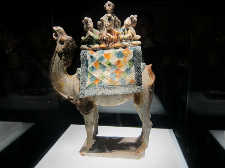 通高58厘米,高24.2厘米,口徑12.4厘米,足徑14.3厘米。典型的盛唐時期的作品,舞樂者均穿著漢族衣冠,使用的卻大都是從西域傳入的樂器,表現(xiàn)的是流行于開元、天寶時期的“胡部新聲”的新舞樂。這組俑以狹小的駝背作舞臺,卻承載陣容龐大的樂隊來表現(xiàn)當(dāng)時流行的新舞樂,大膽運(yùn)用了藝術(shù)夸張,充滿想象與浪漫。制作工藝精湛,形態(tài)逼真?zhèn)魃,使人仿佛耳聞悠揚(yáng)的樂曲。釉色鮮明亮麗,協(xié)調(diào)自然,堪稱唐三彩中的極品。不僅具有很高的藝術(shù)欣賞價值,對研究盛唐時期的音樂、歌舞以及中外文化交流也具有重要的參考價值。