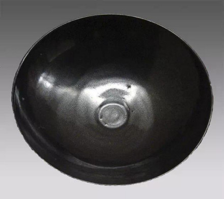 高9厘米、口徑30.2厘米、足徑11.8厘米。碗大口小足,胎質(zhì)灰白,通體施黑釉。油層表面布滿了大小不一,稱金屬光澤的小圓點,這些圓點就像浮在水面上的油滴一樣,因此被成為”油滴釉“。油滴釉是黒釉中一個特殊的種類,屬于結(jié)晶釉。迄今所見的油滴釉器多出自建窯,胎體較厚,器型較小,這件黑釉“油滴”瓷碗,胎體厚重,釉面漆黑。如此之大和如此之美的油滴碗,具有典型的北方窯口的工藝特征,特別是環(huán)布碗底的油滴斑點,晶瑩透亮,增添迷人的色彩,堪稱瓷中珍品。是迄今所見同類器物中體量最大的一件。 |