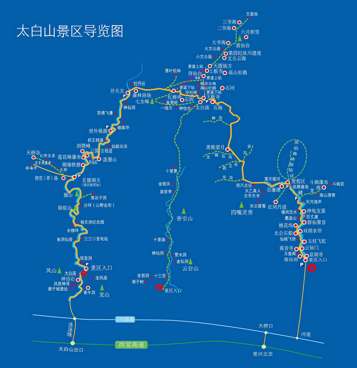 太白國家森林公園以園內40公里旅游公路和28公里人行旅游步道聯結公園八個景區(qū)140多個景物景點,其主要的景區(qū)景點有: