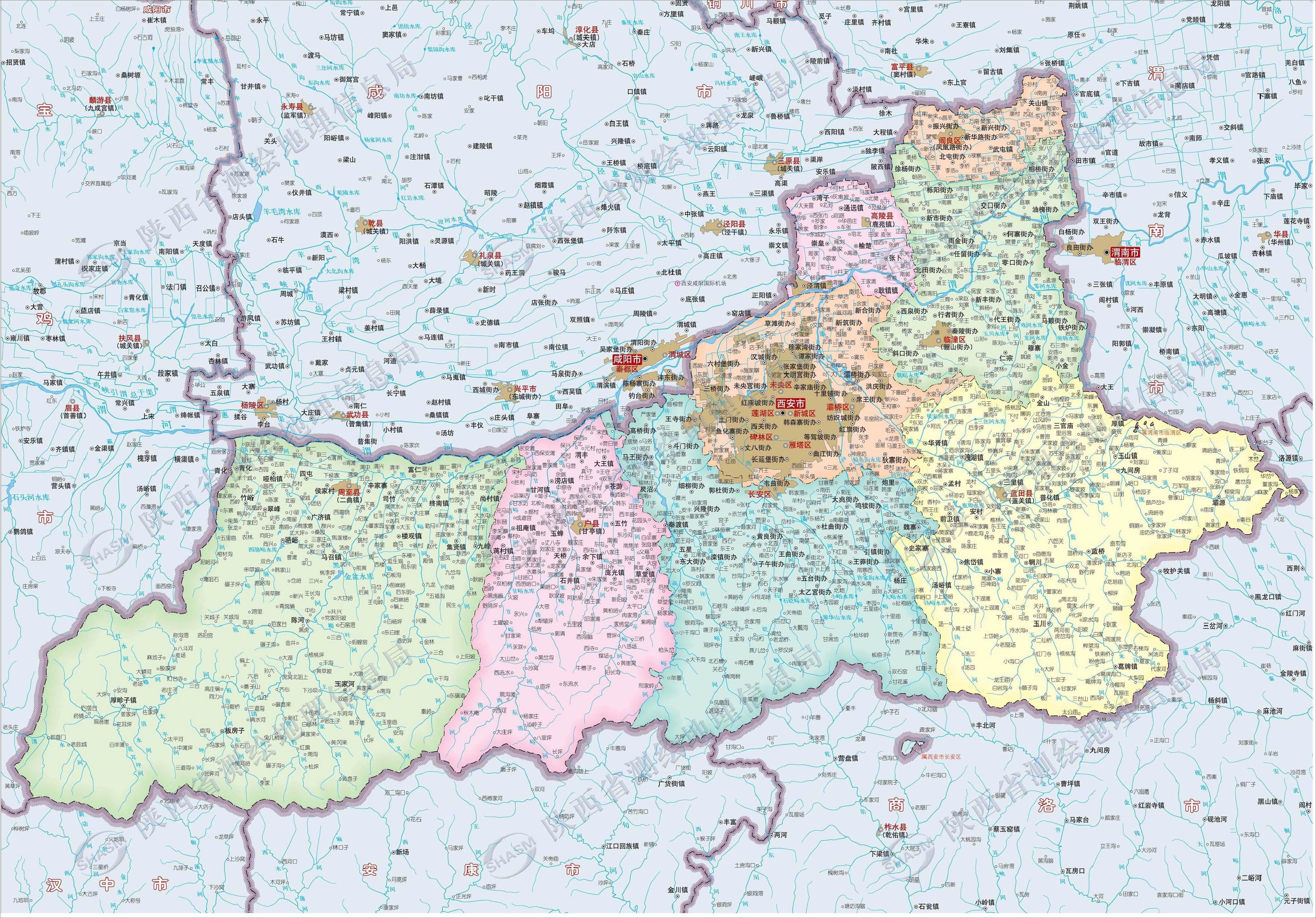 西安市位于黃河流域中部關(guān)中盆地,北臨渭河和黃土高原,南鄰秦嶺。東以零河和灞源山地為界,與渭南市華州區(qū)、商洛市商州區(qū)、洛南縣相接;西以太白山地及青化黃土臺塬為界,與眉縣、太白縣接壤;南至北秦嶺主脊,與佛坪縣、寧陜縣、柞水縣分界;北至渭河,東北跨渭河,與咸陽市區(qū)、楊凌區(qū)和三原、涇陽、興平、武功、扶風、富平等縣(市)相鄰。轄境東西長約204千米,南北寬約116千米,總面積10108平方千米。