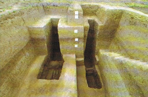 墓地東、西、北部均有圍溝環(huán)繞,形成長(zhǎng)321、寬273米南部敞開(kāi)的南北向長(zhǎng)方形墓園。墓葬群位于墓園正中偏北,墓地中軸延長(zhǎng)線正南500米處為呂氏家廟“呂氏莊閣云寺”故址。墓葬排列脈絡(luò)清晰,中軸線上自南向北縱向貫魚(yú)式為長(zhǎng)子長(zhǎng)孫系列,橫向則按輩份分排布置。墓地使用時(shí)間為宋神宗熙寧七年(公元1074年)至徽宗政和元年(公元1111年),共計(jì)埋葬五代呂氏族人。