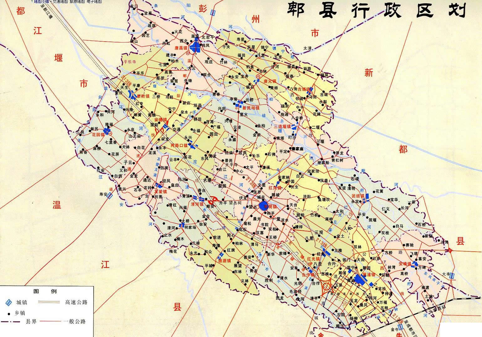 郫縣轄14個(gè)鎮(zhèn):郫筒鎮(zhèn)、犀浦鎮(zhèn)、紅光鎮(zhèn)、安靖鎮(zhèn)、團(tuán)結(jié)鎮(zhèn)、唐昌鎮(zhèn)、三道堰鎮(zhèn)、新民場(chǎng)鎮(zhèn)、花園鎮(zhèn)、安德鎮(zhèn)、唐元鎮(zhèn)、德源鎮(zhèn)、古城鎮(zhèn)、友愛鎮(zhèn)