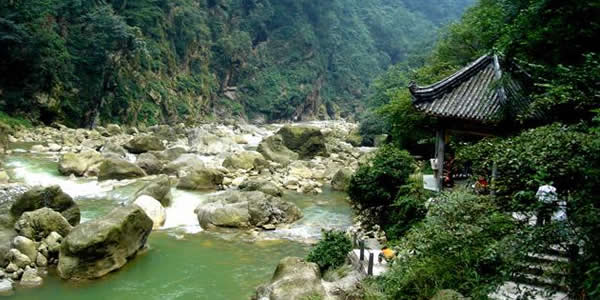九龍溝:位于崇州市西北三郎鎮(zhèn),因“九溝九槽九條龍”的神話傳說(shuō)而得名。這一地區(qū)為龍門山脈口段前斷裂帶,地質(zhì)構(gòu)造復(fù)雜,群山在海拔700米到3868米之間起伏變化,相對(duì)高差懸殊較大,懸崖陡峭,多飛瀑迭湍、深溝狹谷,有眾多的酷似龍形的奇峰怪石和飛瀑流泉。九龍溝內(nèi)水石相擊之聲如龍吟似龍嘯,巨石躺臥之狀如龍盤(pán)似龍睡,山峰聳立之形如龍騰似龍臥,簡(jiǎn)直就是活生生的“人間龍宮”。崇州百姓中流傳有“九條龍從九龍池出游,在九龍山會(huì)合,回九龍溝安家,并在龍?zhí)蚴狭粝戮艤暇挪劬艞l龍”的神奇?zhèn)髡f(shuō)。九龍溝景區(qū)面積175平方公里,其中游覽面積32平方公里,由九龍溝水石景區(qū)、大西山原始森林景區(qū)和古寺等三部分組成,以九龍溝動(dòng)態(tài)水石景觀最引人入勝,是風(fēng)景區(qū)的主要部分,有化石巖、珍珠泉龍石巖、龍女浣紗池、龍?zhí)蚴、鉆天峰、響水溝、九龍飛瀑等景觀,其中龍女融積雪而成的“九龍飛瀑”,寬10余米,高100余米,是成都地區(qū)不可多見(jiàn)的大瀑布。密林中隱藏著雄偉的古剎,是成都地區(qū)山林中保存較完好的規(guī)模較大的古廟。