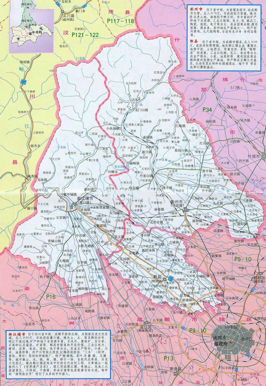 彭州市位于四川省會成都西北部,距成都市區(qū)25公里,人口78萬,面積1420平方公里,是成都市人口第三,面積第二的小康市。彭州是古蜀國建都立業(yè)的核心地區(qū),自秦漢以來,建縣設(shè)郡達(dá)2000多年,有著悠久的歷史文明,素有“天府金盆”、“蜀漢名區(qū)”之美譽。