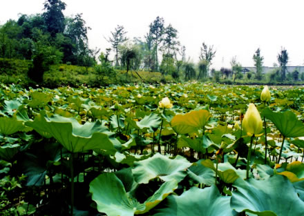潭內種植有許多觀賞荷花,初夏時節(jié),碧荷連天、綠滿大地、蓮花朵朵,香飄滿園。輕風吹過,花兒嬌羞欲語、隨風起舞、揺曵生姿,為這寧靜的湖光山色憑添了許多的生機和靈氣。由此讓我們不禁想到周敦頤的《愛蓮說》:“蓮,花之君子者也。”“出淤泥而不染,濯清漣而不妖,中通外直,不蔓不枝,香遠益清,亭亭靜植,可遠觀而不可褻玩焉!