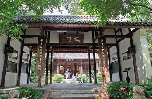 柴門是中軸線上的第四重建筑,也是最小、最簡樸的建筑。它原本是杜甫營建草堂時所造的院門。因?yàn)榈桶喡,詩人作了如此命名。門上匾額“柴門”二字是著名畫家潘天壽所書。