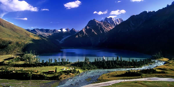 雀兒山屬沙魯里山脈北段,地勢呈西北——東南走向,是典型的冰川地貌,海拔5000米以上的山峰有30座,最高峰絨麥俄扎,海拔6168米,終年積雪不化,是四川省第四高峰。雀兒山下的新路海風(fēng)景區(qū)在川藏公路之側(cè),距德格縣城100公里,海拔4040米。新路海平均深度10米,最深處15米,是甘孜州著名的冰蝕湖。水源由雀兒山冰川和積雪消融供給,湖尾流出的溪流為措曲河源頭之一。新路海藏語各玉龍拉措,意為“傾心之湖”,相傳格薩爾王傳的愛妃珠牡來到湖邊,被秀麗的湖光山色和幽靜的環(huán)境所吸引,緋徊湖邊留連忘返。后人為了紀念珠牡,取名“玉龍拉錯”。玉龍拉錯及周圍生態(tài)原始、完整、晶瑩的冰川從海拔五千米的粒雪直瀉湖濱草原,極為壯觀。湖泊周圍由高原云杉、冷杉、柏樹、杜鵑樹和草甸環(huán)繞。藍天白云,雪峰皚皚,冰川閃爍,青山融融,綠草茵茵,波光粼粼。湖岸珍禽異獸出沒,湖中野鴨成群,魚兒游弋,夏秋季節(jié),山花爛熳,爭芳斗艷,真可謂世間仙境。