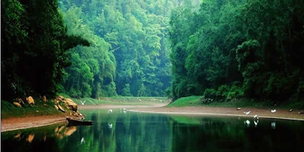 (4)象鼻河 象鼻河位于回龍湖尾段,經(jīng)岳池縣城出發(fā)車行至天平鎮(zhèn)回龍湖坐船可到,河長約四公里。因河端有一小山,形態(tài)奇特,遠(yuǎn)望酷似大象的鼻子,所以這條河就叫象鼻河。象鼻河寬五六丈,象一顆長寶石鑲嵌在兩岸的高巖之間。象鼻河西側(cè)有雞頸坳和庵堂坡相互攀比,各自把山巖泉水盡量拋出。飛瀑直下,銀花四濺,疑是仙人,丟下白練。兩岸樹木,青翠欲滴,藤繞山石,鳥戲其間,蜂飛蝶舞,何等悠然。乘舟慢進(jìn),有山風(fēng)習(xí)習(xí),涼爽撲面。清澈河水,擁抱船板,發(fā)出咕咕細(xì)語,情意綿綿。上游涌來清流,與河水交融,握手言歡。游魚競技,爭先恐后,其樂融融,游人贊嘆。“青山之中藏小河,木船水頭蕩清波。有人興起一聲吼,魚逃鳥飛野兔躲。誰說人間無仙境?不信請(qǐng)來象鼻河。”象鼻河匯入的回龍湖鑲嵌在兩岸直壁芳草如茵的群山之中,這里水面遼闊,一碧如玉;湖上輕舟飛蕩,魚歌陣陣,銀鱗競躍,水鳥爭翔,陰雨時(shí)山色空 蒙,晴天里滿目蒼翠,是川東的又一西子湖。湖邊近500畝的名優(yōu)水果和各種反季節(jié)果類,更是錦上添花。