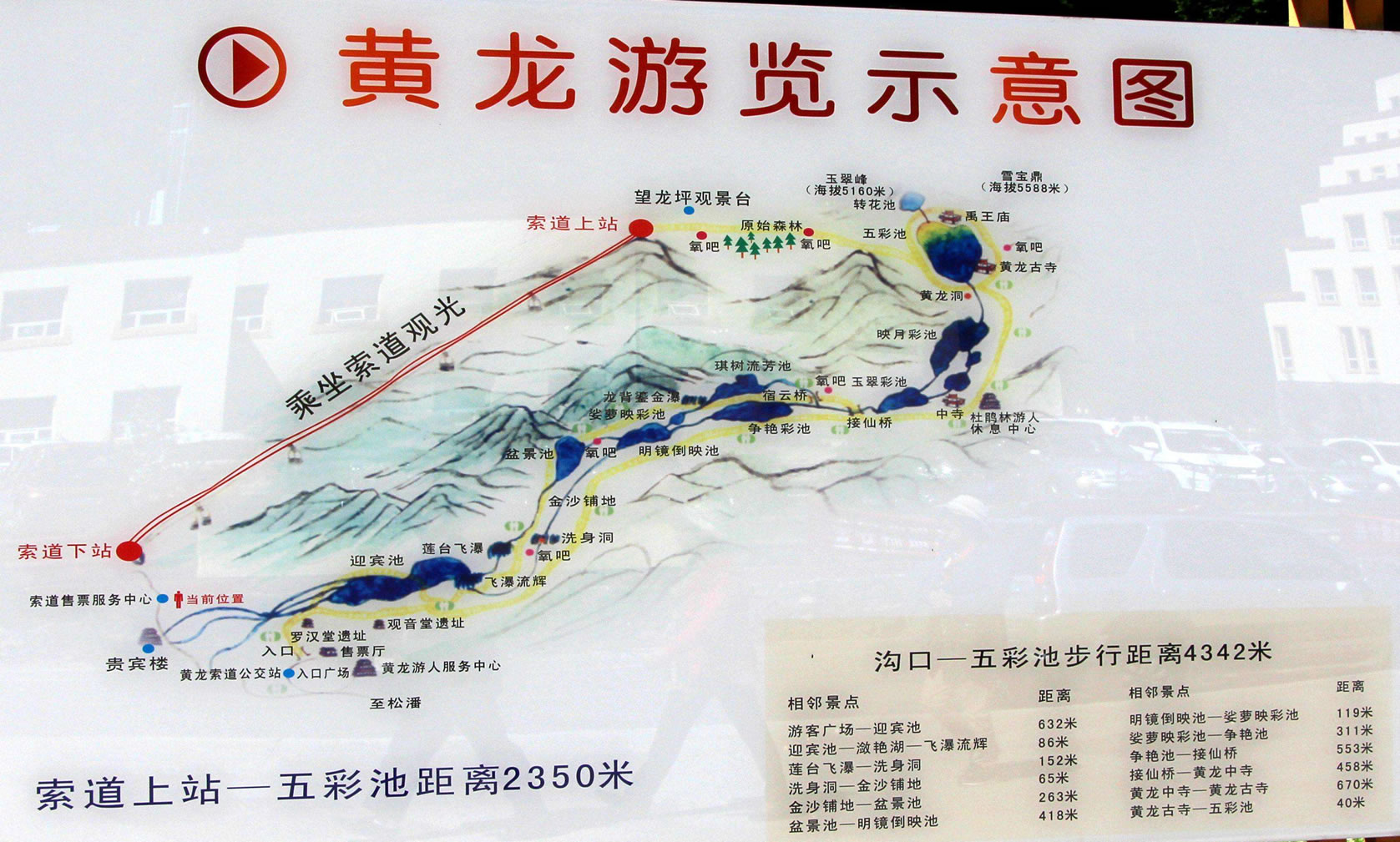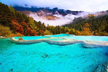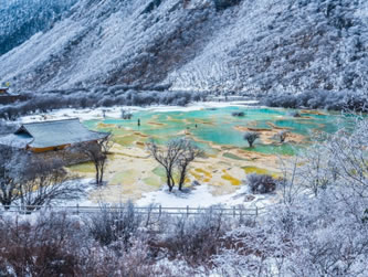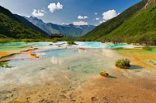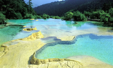 進(jìn)入黃龍景區(qū),首先看到的是一組精巧別致、水質(zhì)明麗的池群--迎賓池。池子大小不一,形狀奇特,色彩艷麗,錯落有致,四周山岳環(huán)峙,林木蔥蘢,山間野花競放,彩蝶飛舞。山間石徑曲折盤旋,點綴著觀景亭閣,倍添情趣。