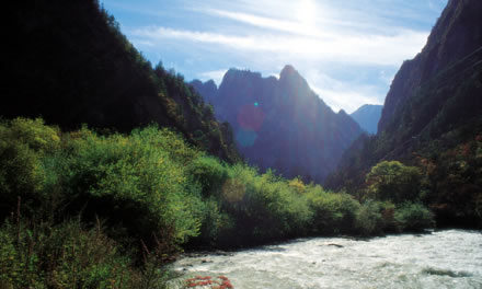 丹云峽以俊秀印峽谷風(fēng)光,成為黃龍的“五絕”之一。它擁有豐富的樹種、灌木和花草,是植物愛好者的天堂。丹云峽景區(qū)起子玉筍群峰,止于扇子洞,綿延18.5公里,落差1300米,峰谷高差為1000至2000米。這里冬天一片雪白,夏天山林翠綠,尤其是春天漫山遍野的紅杜鵑、秋天一路楓葉紅遍峽谷,那情景仿佛夕陽之下的火燒云從天而降,丹云峽因此而得名。山生云,樹生風(fēng),丹云峽幾乎每天都有云霧從林中升起,繚繞山間,時隱時現(xiàn)。丹云峽內(nèi)森林密布,發(fā)源于雪寶頂?shù)母⒔趰{內(nèi)奇石怪巖的夾逼中奔游林間,好似一條白龍搖頭擺尾,與身邊的黃龍遙相呼應(yīng)。