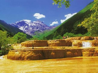 位于岷山主峰雪寶頂,下臨涪江源流——涪源橋,是一條長7.5公里、寬1.5公里的緩坡溝谷。溝內(nèi)布滿乳黃色巖石,遠(yuǎn)望好似婉蜒于密林幽谷中的黃龍,黃龍溝名即來源于此。明代(公元1368~1644年)在此修建了黃龍寺,用以奉祀黃龍。黃龍溝以它“奇、絕、秀、幽”的自然景觀而蜚聲中外,它酷似中國人心目中“龍”的形象,藏民稱之為“東日·瑟爾磋”,意為東方的海螺山(指雪寶頂)、金色的海子(指黃龍溝),并沿襲著一年一度盛況煊赫、波及西北各省區(qū)各族民眾參加的轉(zhuǎn)山廟會。 黃龍溝連綿分布鈣化段長達(dá)3600米,最長鈣化灘長1300米,最寬170米;彩池數(shù)多達(dá)3400余個;邊石壩最高達(dá)7.2米。