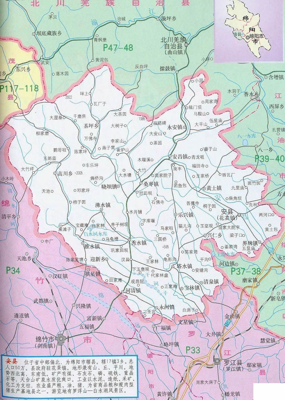 安縣位于四川盆地西北部,距成都110公里,距綿陽(yáng)科技城10公里?h境山丘壩兼有,幅員1404平方公里??cè)丝?0萬(wàn)人,轄4鄉(xiāng)16鎮(zhèn)。安縣氣候宜人,生態(tài)環(huán)境優(yōu)美。屬亞熱帶濕潤(rùn)季風(fēng)氣候,氣候溫和,雨量充沛,四季分明,日照充足,無(wú)霜期長(zhǎng)。年均氣溫16.3℃,年均降水量1260mm,空氣質(zhì)量常年達(dá)國(guó)家二級(jí)標(biāo)準(zhǔn),森林覆蓋率達(dá)42%?h內(nèi)交通四通八達(dá),人流、物流進(jìn)出快捷方便 ,現(xiàn)代通訊覆蓋全縣,并開(kāi)通了ADSL業(yè)務(wù)和高速寬帶網(wǎng)絡(luò),光纖有線電視遍布城鄉(xiāng)。自然資源豐富,有水泥石灰石、磷礦、煤、硫鐵礦、重晶石、鋁土礦等礦產(chǎn)資源29種,儲(chǔ)量豐富;有動(dòng)物資源948種,其中大熊貓、金絲猴等國(guó)家一、二級(jí)保護(hù)動(dòng)物77種;有植物資源814種,其中銀杏、珙桐等國(guó)家一級(jí)珍稀植物及棗皮、杜仲、烏藥等中藥材資源100多種。工業(yè)基礎(chǔ)良好。電子、建材輕化、能源、化工、食品等支柱工業(yè)日益壯大。農(nóng)業(yè)生產(chǎn)條件優(yōu)越,農(nóng)村經(jīng)濟(jì)持續(xù)發(fā)展。雜交水稻制種、優(yōu)質(zhì)水稻、無(wú)公害蔬菜、水果、無(wú)規(guī)定疫病畜禽養(yǎng)殖、水產(chǎn)、蠶桑、魔芋、棗皮等農(nóng)業(yè)產(chǎn)業(yè)化經(jīng)營(yíng)蓬勃發(fā)展。