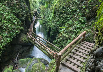 五龍溝古稱蠻河溝,長約8千米,因傳說古時有五條神龍隱藏于溝中而得名。其中的景色有金娃娃沱,景色絕佳的龍隱峽棧道,石筍巖,回音壁等。