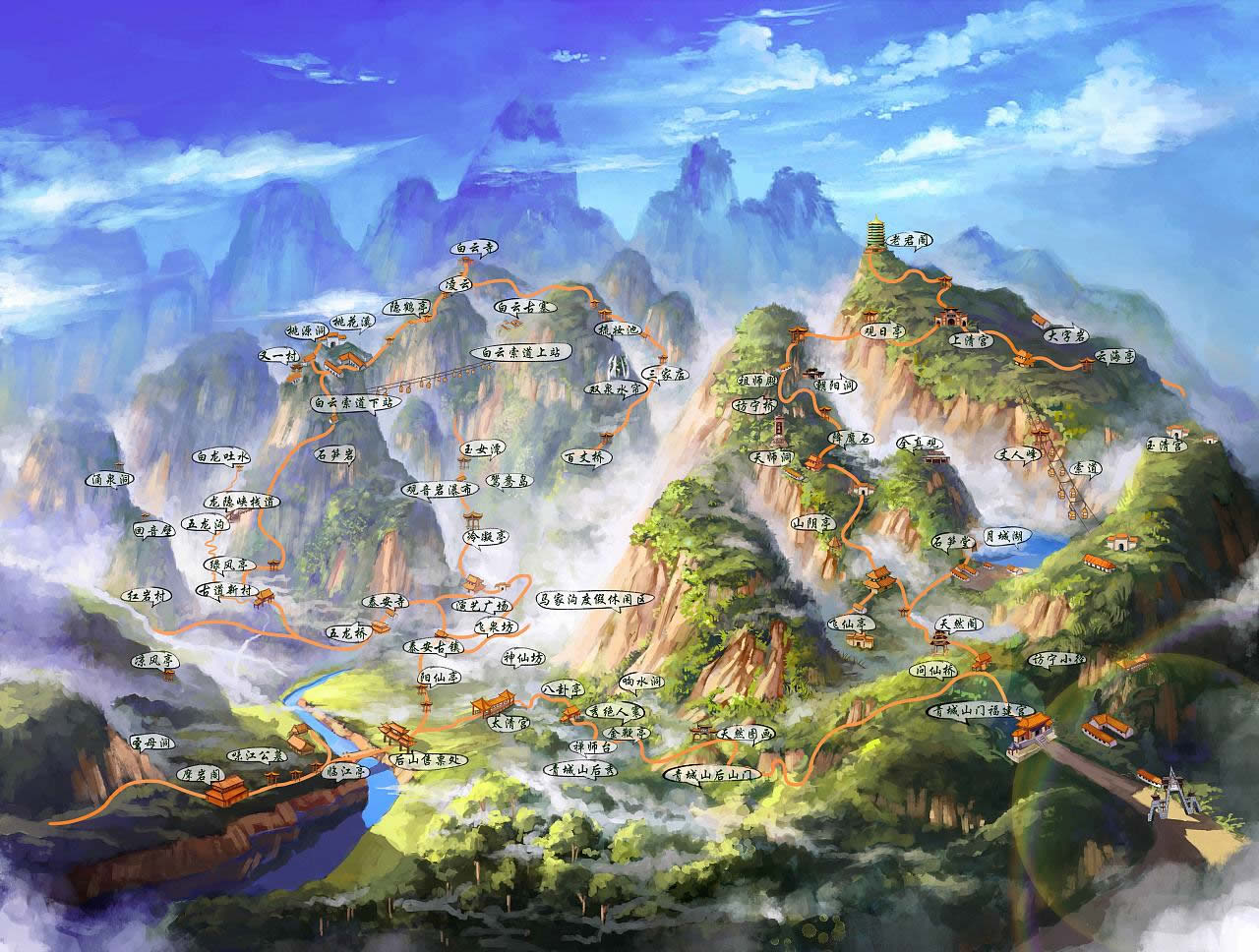 前山以常觀、上清宮為核心,宮觀相望。建福宮、祖師殿、朝陽洞等人文景觀與金鞭巖、石筍峰、丈人山等自然風(fēng)光彼此增色。主要景點(diǎn)為老君閣、月城湖、天師洞、上清宮、五洞天、仙履清涼、碧翠青城、天然圖畫、祖師殿、朝陽洞、圓明宮、建福宮。
