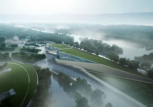 三星堆新館共三個(gè)堆體,東側(cè)兩個(gè)堆體為展陳空間,西側(cè)一個(gè)堆體為后勤庫區(qū)。”新館屋頂采用斜坡覆土形態(tài),建筑消隱融入環(huán)境,與一號(hào)館形體左右呼應(yīng);建筑形成三個(gè)沿中軸排列的覆土堆體,也寓意“堆列三星”。