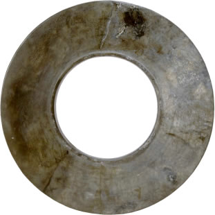 商玉戚形璧:此文物為商代的玉器,平面呈鞋底形,兩面平,邊緣較薄,中部較厚,有一圓形穿孔,孔緣向兩面凸起成高領(lǐng)。凸領(lǐng)呈圓筒形,中腰微向內(nèi)收。現(xiàn)收藏于三星堆博物館。