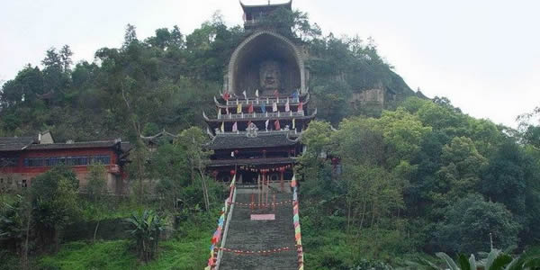 榮縣大佛:榮縣城東0.5公里有全國第二大佛——榮縣大佛,大佛寺內(nèi)半山之上,有一尊巍峨的石刻如來坐佛佛像,世稱榮縣大佛。大佛依山崖鑿成,通高36.67米,頭長8.76米,肩寬12.67米,膝高12米,腳寬3.5米,其頭部長8.76米,肩寬12.67米,腳寬3.5米。是一尊如來佛像,僅次于樂山彌勒大佛,為中國第二石刻大佛!s縣大佛開鑿于北宋元豐八年(公元1085年),完工于公元1092年,歷時八年始完工。大佛的頭頂上方有一道石條卷拱護(hù)罩,上刻“大開覺路”四字;崖頂上還有磚閣一座,遠(yuǎn)看像在戴在大佛頭頂上的寶冠。 大佛鑿刻完工后,即修有殿宇保護(hù),根據(jù)《古今圖書集成》記載,時有“架殿十層,高四十七丈,闊十五丈”、“舊時寺門、抵今溪岸”。可見當(dāng)時的恢宏氣勢,其后幾毀幾修,現(xiàn)存的殿宇為清代嘉慶、道光年間所建。1988年重建的大佛護(hù)身樓,是仿木仿古重檐歇山式建筑,既保護(hù)了大佛,又具游覽價值,逐層登樓近瞻佛容慈顏,從上到下盡觀大佛偉岸雄姿,鳥瞰榮城風(fēng)貌,眺望遠(yuǎn)山近巒。