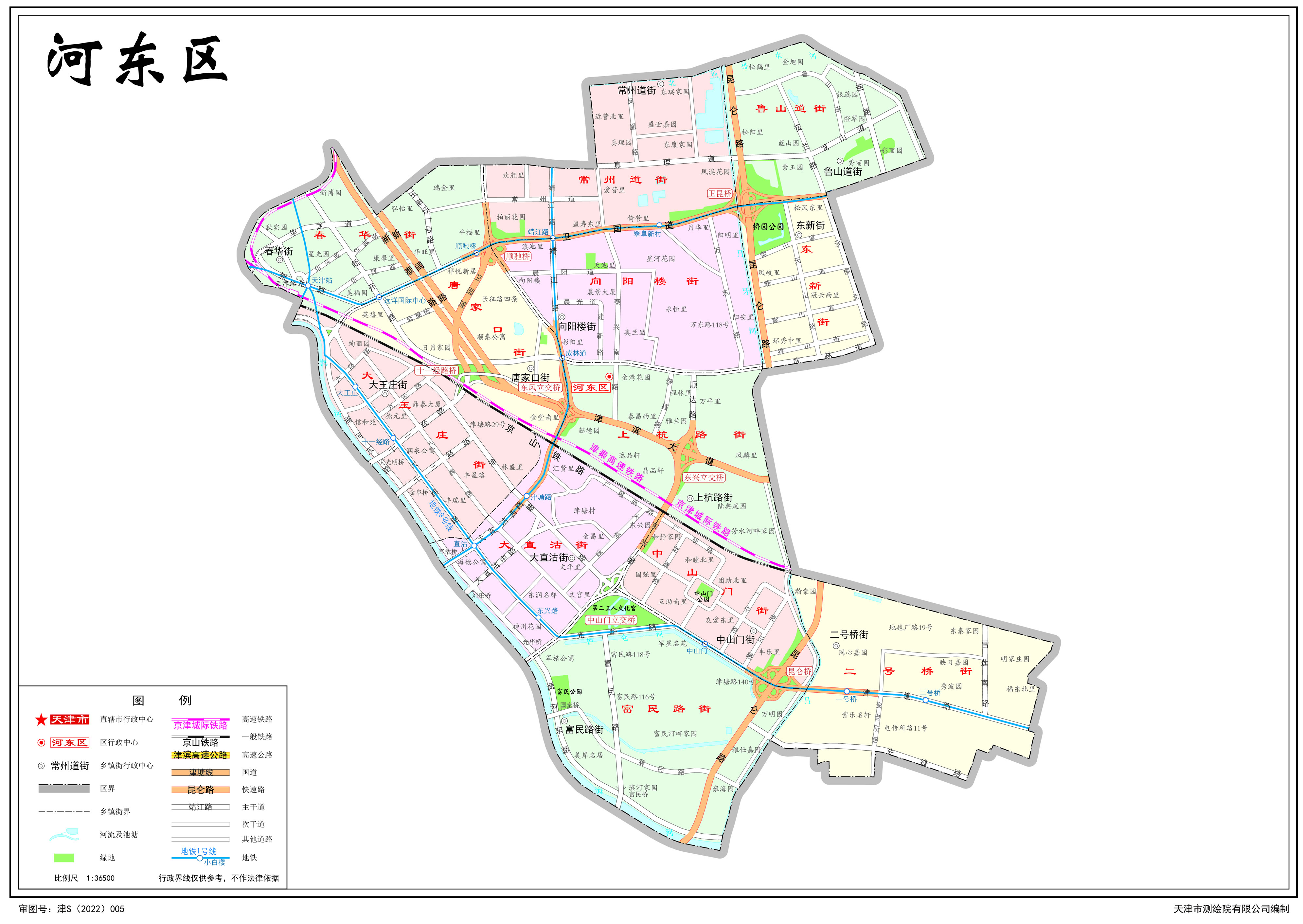 河?xùn)|區(qū)轄13個(gè)街道:大王莊街道、大直沽街道、中山門街道、富民路街道、二號(hào)橋街道、春華街道、唐家口街道、向陽(yáng)樓街道、常州道街道、上杭路街道、東新街道、魯山道街道、天津鐵廠街道