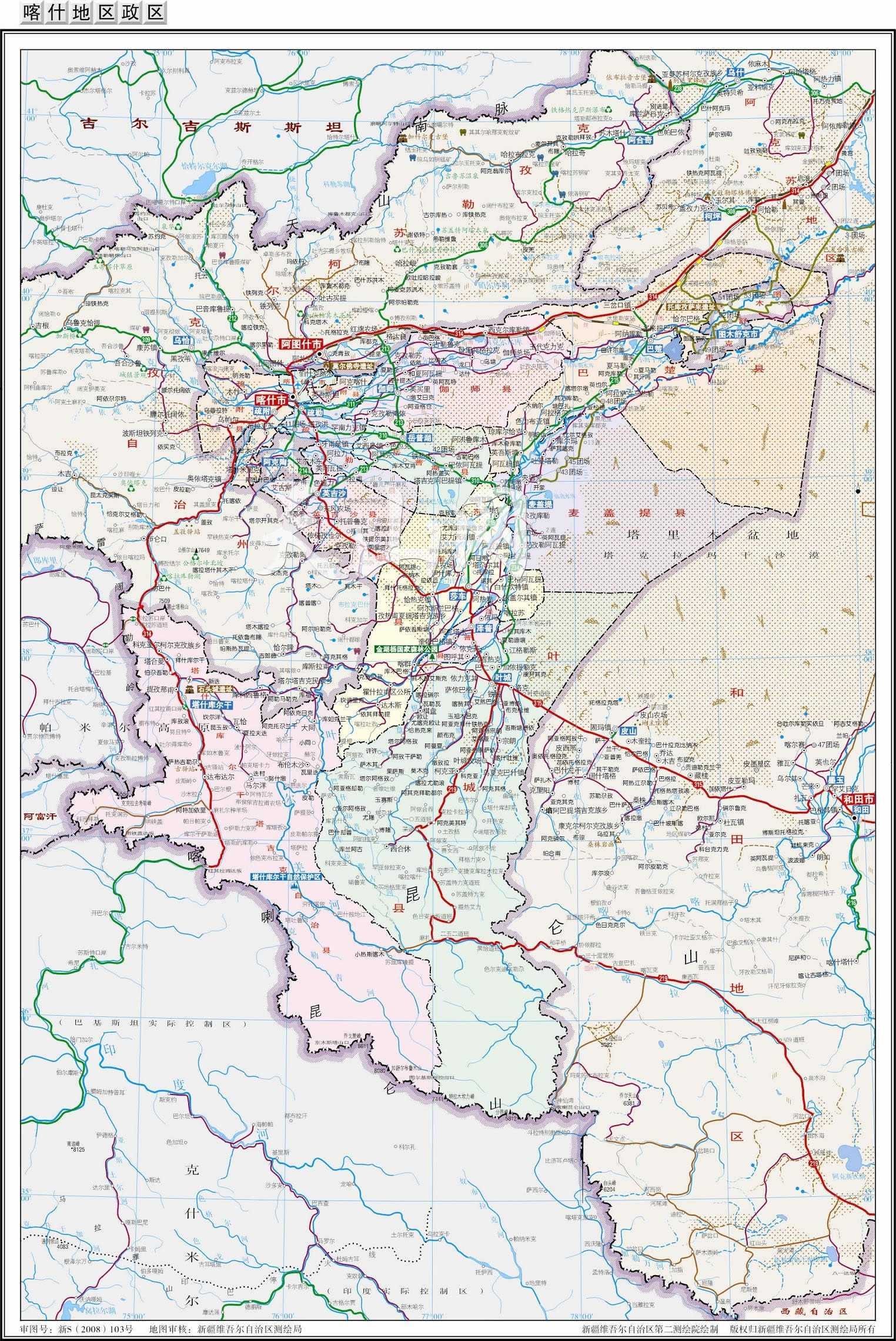塔什庫爾干塔吉克自治縣 面積25000平方千米,人口41188,政府駐塔什庫爾干鎮(zhèn),下轄2個鎮(zhèn)、10個鄉(xiāng)