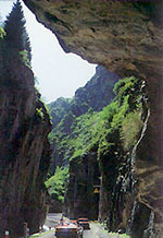 天池石門:景名為“石門一線”,海拔1500米,位于大天池以北5.9公里處,為一段被三工河古河道切割形成的石峽谷,這道山口是進入風(fēng)景區(qū)的天然門戶;峽谷長約百余米,最窄處僅十來米寬,兩側(cè)直立的巖壁高逾數(shù)十米,形勢峻險,仰視見一線天,側(cè)邊盤繞三工河水。