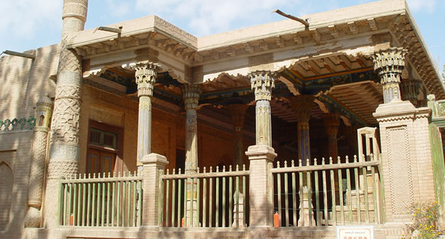 香妃墓是阿帕霍加墓的別稱,坐落在喀什市東北郊5公里處的浩罕村,是伊斯蘭教白山派首領阿帕克霍加及其家族的墓地,占地面積30畝,始建于公元1640年前后,是典型的伊斯蘭式古陵墓建筑。