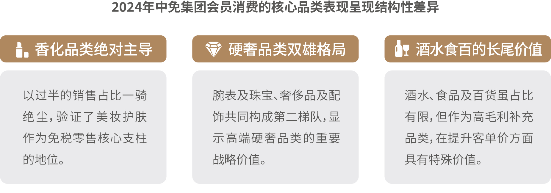 在核心品類消費(fèi)維度,彩妝香水增長(zhǎng)亮眼,外籍旅客、男性客群、國(guó)潮品牌成為品類重要的增長(zhǎng)點(diǎn);奢侈品及配飾方面,消費(fèi)結(jié)構(gòu)多元化,超高端市場(chǎng)增長(zhǎng)顯著,輕奢區(qū)間保持穩(wěn)定需求;腕表及珠寶方面,品類分化顯著,首飾品類同比增長(zhǎng),腕表需求區(qū)域性特征突出;酒水方面,市場(chǎng)擴(kuò)容升級(jí),品類及人群消費(fèi)分層顯著,渠道互補(bǔ)發(fā)展,呈現(xiàn)出規(guī)模擴(kuò)張與結(jié)構(gòu)升級(jí)并行的顯著特征;食品及百貨方面,市場(chǎng)穩(wěn)健擴(kuò)容,圈層特征鮮明,Z世代和銀發(fā)人群正在引發(fā)新的情感和健康消費(fèi)變革。