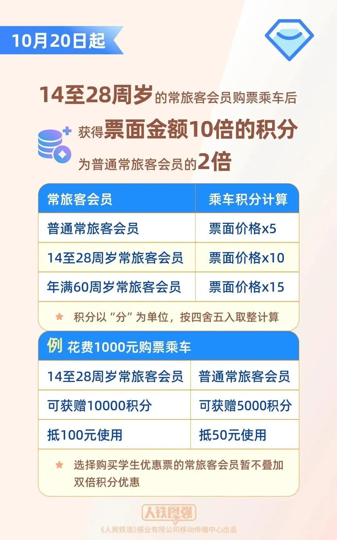 10月20日起,14至28周歲的常旅客會(huì)員購(gòu)票乘車(chē)后將獲得票面金額10倍的積分,為普通常旅客會(huì)員的兩倍,即普通常旅客會(huì)員花費(fèi)1000元購(gòu)票乘車(chē),可獲贈(zèng)5000積分、抵50元使用;