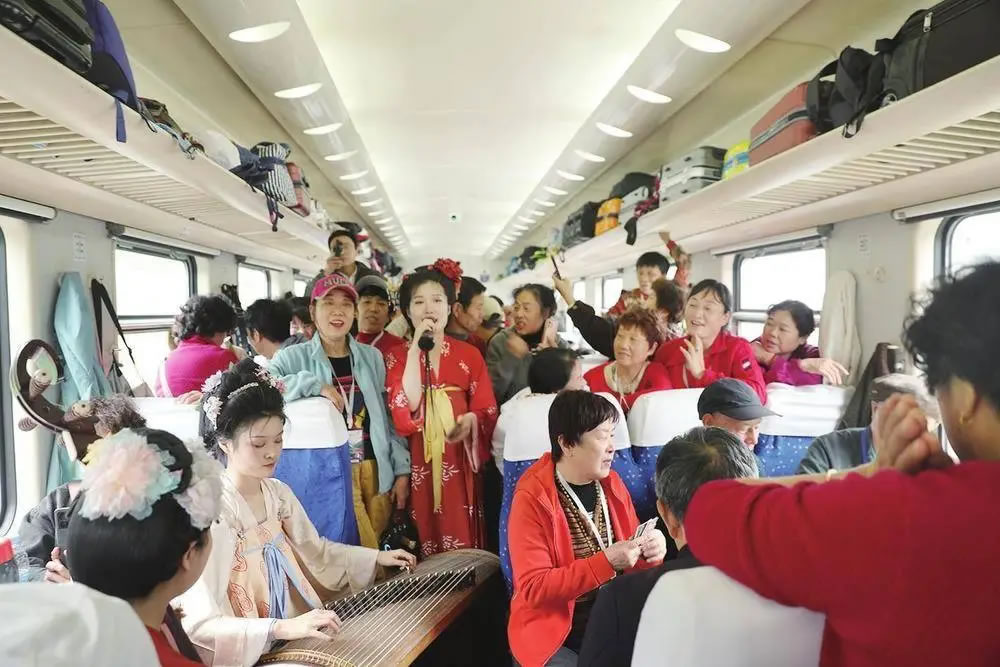 秋日的旅途被一系列精心策劃的活動填滿。候車室內(nèi),老年旅客們拉起“環(huán)秦嶺賞秋之旅”的橫幅合影留念,臉上洋溢著笑容;列車上,悠揚(yáng)的古箏與清越的琵琶聲交織,唐風(fēng)歌曲緩緩流淌,瞬間讓車廂充滿雅致氛圍。身著古裝的特型演員帶來了驚喜互動,他風(fēng)度翩翩地與旅客們展開詩詞對答。旅客們踴躍接句,答對的人還能獲得定制小禮品,車廂內(nèi)歡聲笑語不斷。