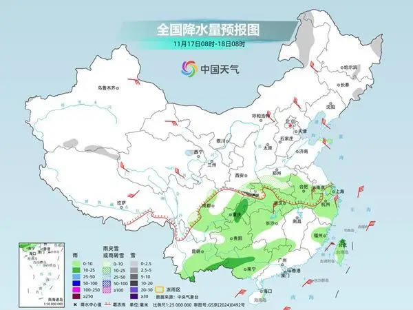 今明兩天(11月17日至18日),寒潮繼續(xù)給我國中東部帶來大風、降溫天氣,氣溫將自北向南陸續(xù)跌入低谷,并且會大面積創(chuàng)下半年來新低。與此同時,寒潮帶來的降雪今天將逐漸減弱結束,南方陰雨有所增多,明天起全國大部將轉為晴朗干燥的天氣格局。