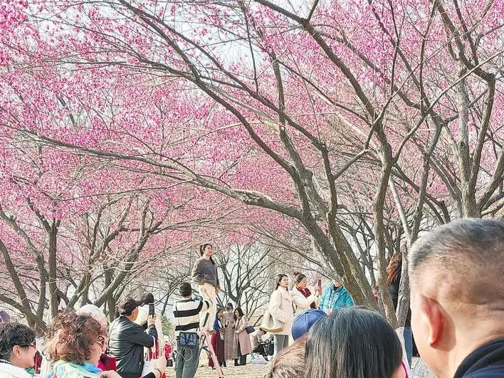 雖是工作日午后,坡上已有數(shù)百位市民游客漫步賞玩;ㄓ叭顺敝校藢3潭鴣淼臄z影愛好者架起“長槍短炮”,更有許多家庭扶老攜幼,在梅林間游玩、野餐。曾是約拍行業(yè)淡季的隆冬時節(jié),也成了旺季。“花期比往年早了近一個月,好幾個周末的‘約拍’都排滿了。”攝影愛好者周女士邊調(diào)整鏡頭邊說。據(jù)攝影師“四葉草”介紹,周末這里人流如織,即便今天是工作日,前來拍照的游客依然不少。“目前‘梅花坡’花開得最盛,大家都搶著來出片,競爭壓力不小。眼下的梅花是開年第一波熱度。”