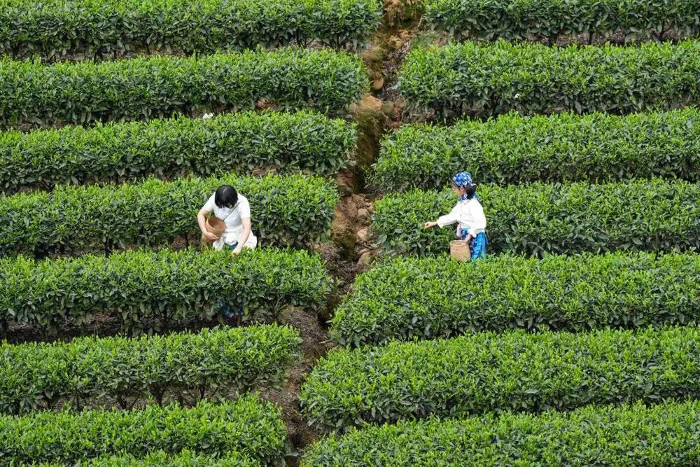 4月5日,人們在四川省雅安市牛碾坪萬畝觀光茶園體驗(yàn)采茶。新華社記者胥冰潔 攝