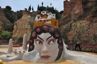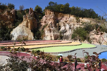 以沙成林,歷經(jīng)千古的沙林,必為一“怪”。眾峰參差,形異神幻,必是一“奇”。七彩紛呈,流光溢彩,妙筆在天。沙內(nèi)滲泉,甘露長漣,滋沙養(yǎng)人。風沙不揚,水沙不染,冥冥費解。依山臨湖,磅礴氣概,天地奉獻。這寰于一絕的奇景,吸向性,潛在力,輻射度,都具有特殊價值,憑借這一世界獨有的資源優(yōu)勢,借助沙雕藝術(shù)魅力,經(jīng)過精心策劃,認真組織,于2001年至今成功舉辦了五屆主題分別為“千年夢幻”、“走進名著”、“五洲風采”、“音樂神采”、“爨史風情”的全球首創(chuàng)、世界唯一的國際彩色沙雕節(jié)暨沙雕大賽。
