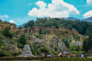 該沙林因風化剝蝕而成,為層巒壘峰狀;又因其以紅、黃、白為主色調(diào),雜以青、藍、黑、灰色,加上季節(jié)、氣候、日照及觀賞角度的不同,產(chǎn)生絢麗多彩的色調(diào),故名彩色沙林,是著名的地質(zhì)旅游景觀。